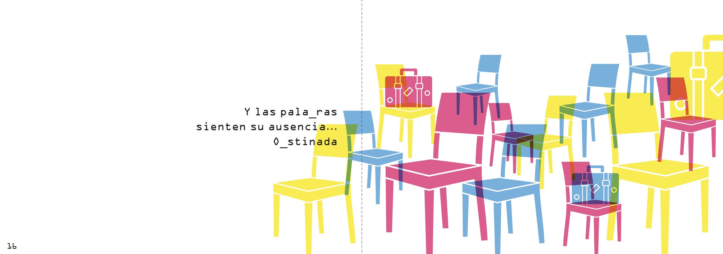 La lletra _ desapareix es un poema sobre lletres que desapareixen del teclat. Un joc gràfic on els colors primaris es barregen per formar altres colors, com les lletres es barregen conformen paraules. L’absència de la lletra B ajudaria el nen a conèixer la resta de l’abecedari i també altres nocions com l’absència...